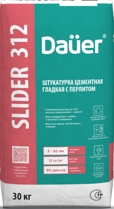 Штукатурка Dauer цементная мелкофракционная гладкая SLIDER 312 с перлитом КП II, ГОСТ 33083-2014- сниженный расход за счет лёгкого наполнителя- перлит