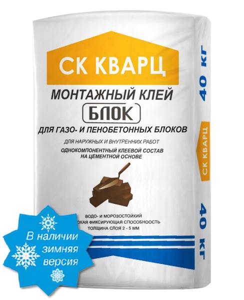 Клей монтажный БЛОК СК Кварц ЗИМНЯЯ ВЕРСИЯ Однокомпонентный клеевой состав на цементной основе. Предназначен для кладки стен и перегородок из блоков и плит на основе ячеистых бетонов: пенобетона и газобетона, а также пено- и газосиликата. Применяется для наружных и внутренних работ.
