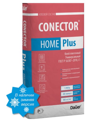 Клей плиточный Универсальный CONECTOR PLUS ЗИМНЯЯ ВЕРСИЯ с противоморозными добавками - Изготовлен на основе портландцемента, фракционированного наполнителя и модифицирующих добавок. Материал экологически безопасен, не содержит вредных примесей. Строительные смеси с противоморозными добавками используют при температуре воздуха ниже +5°С. На морозе реакция между цементом и водой замедляется, и стандартный раствор просто не может нормально схватиться, набрать прочность. Влага при замерзании расширяется и разрушает бетон. Конструкция становится рыхлой. Смеси с противоморозными добавками (ПМД) лишены таких недостатков. При добавлении в сухую смесь ПМД, вода в растворе не замерзает и успевает прореагировать с цементом в полном объёме.