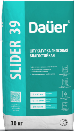 Штукатурка гипсовая универсальная влагостойкая серая SLIDER 39, РН и МН, класс 90/2,0, Dauer 30 кг
